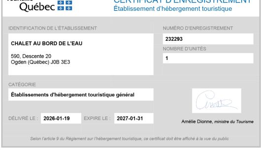 Dépôt de sécurité de 750 $ requis à la confirmation de la location. Ce montant sera remboursé au plus tard 10 jours après la fin de la location, après inspection des lieux, moins les dommages ou le ménage additionnel, s'il y a lieu. Un reçu sera émis lors de la réception du dépôt. | ||
